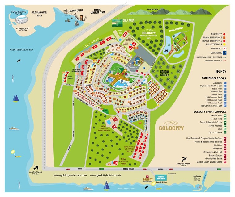 Golf Aqua, Goldcity'nin güneybatı kısmında, toplam 15.004 m² alan üzerine kurulu olup, büyüleyici Toros Dağları, Akdeniz ve Alanya manzaralarıyla Goldcity’nin yeni gözdesi haline gelmiştir. Tüm daireler deniz ve Alanya manzaralı 230 metre uzunluğunda, 1.300 m² yüzölçümüne sahip açık yüzme havuzu 2 adet açık hava jakuzisi Çocuk yüzme havuzu Güneşlenme terası Atıştırmalık bar (Snack bar) Bakımlı yeşil alan Yürüyüş yolları Çocuk oyun alanı Otopark 24 saat güvenlik Yeşil alan ve havuz bakımı Ayrıca, Goldcity’nin tüm hizmetlerinden ve altyapısından faydalanma imkânı.